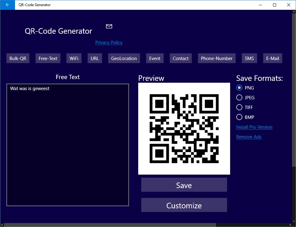 Er zijn veel websites waar je qr-codes kunt maken, sommige zijn gratis en andere werken via een betaaldienst. QR-Code Generator vind je in de appstore van Windows 10, de basisversie kost niets. Je kunt hiermee niet alleen teksten laten omzetten naar een qr-code, maar ook een qr-code maken waarin een visitekaartje, website, wifi-code of sms-bericht verscholen wordt. Je vindt de benodigde functieknoppen hiervoor boven in beeld. Klik bijvoorbeeld op Text en voer een tekst in. De code wordt direct getoond en verandert terwijl je typt. Let op: hoe meer tekens je opgeeft, hoe complexer je qr-code wordt en dat komt het ‘scangemak’ niet ten goede. Controleer je creatie met een qr-codescanner op je smartphone of tablet en bewaar de qr-afbeelding met de knop Save.