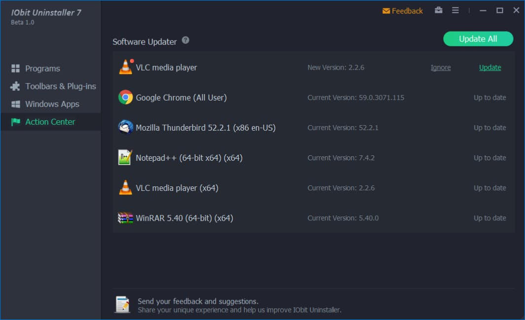 IObit Uninstaller maakt het deïnstalleren van programma’s kinderlijk eenvoudig. Je kunt meerdere programma’s aanvinken waarna IObit Uninstaller ze voor je verwijdert volgens de standaard deïnstallatieprocedure van Windows. Vervolgens gaat IObit Uninstaller op zoek naar achtergebleven resten. Dit kunnen bestanden zijn, maar ook resten in het Windows Register. Dankzij IObit Uninstaller verwijder je programma’s echt grondig. IObit Uninstaller is al vaker genoemd in deze rubriek, maar brengen we nogmaals onder je aandacht vanwege een nieuwe functie in versie 7. Er is een ingebouwde ‘software patcher’ aanwezig. Hierbij kijkt IObit Uninstaller of je van belangrijke programma’s de laatste versie hebt. Werkt je met een verouderde programmaversie? Dan kan IObit Uninstaller het programma bijwerken naar de meest recente versie.
