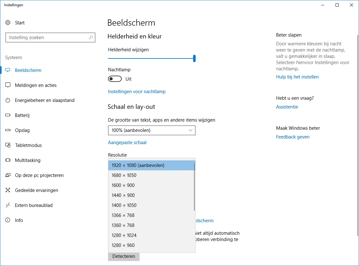 Wil je graag weten op welke resolutie je momenteel aan het werk bent? Klik in Windows 10 met de rechtermuisknop ergens op het bureaublad en kies voor Beeldscherminstellingen. Onder Resolutie bekijk je de huidige waarde. Meestal staat de hoogst mogelijke resolutie al ingesteld.