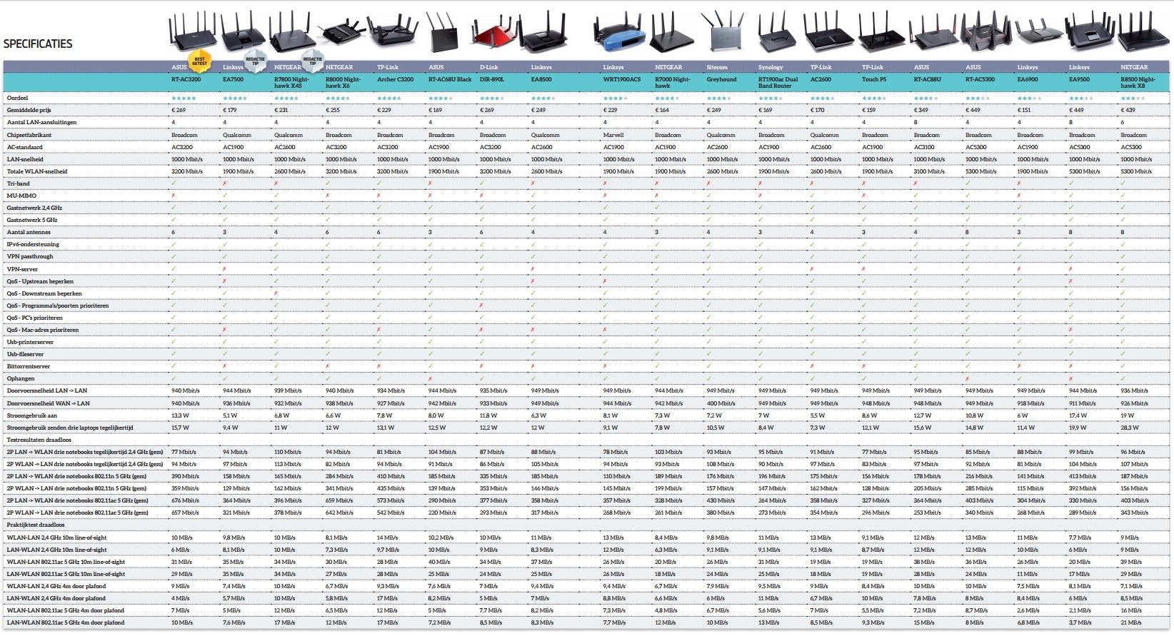 In de tabel (pdf) vind je de testresultaten van de 19 geteste routers. Klik op de tabel voor een grotere versie.
