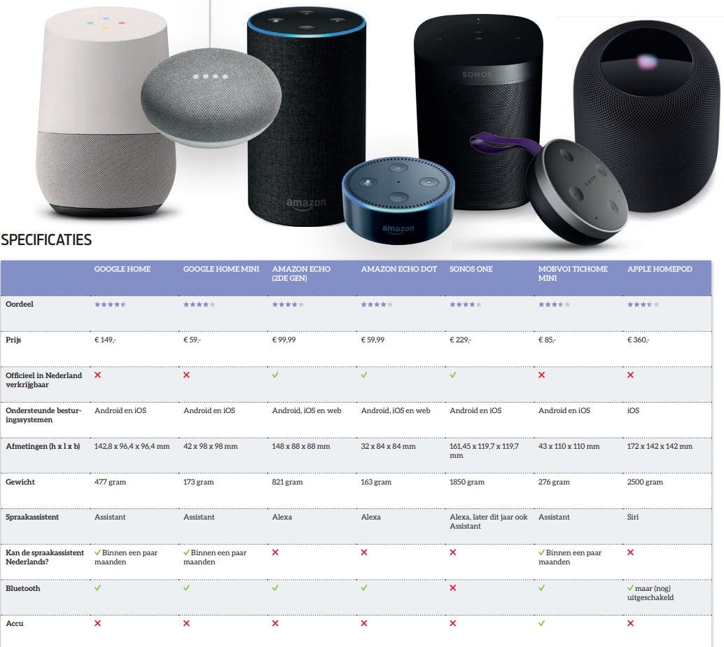 De interessantste modellen zijn wat ons betreft de Amazon Echo 2 en Google Home. Die zien er sjiek uit, bieden goed geluid en hebben slimme assistenten waar je vandaag de dag al veel mee kunt. En Google Assistant spreekt straks als eerste ook Nederlands. Welke smarthome-speaker voor jou de beste koop is, hangt vooral van je budget en favoriete spraakassistent (en bijbehorend ecosysteem) af.