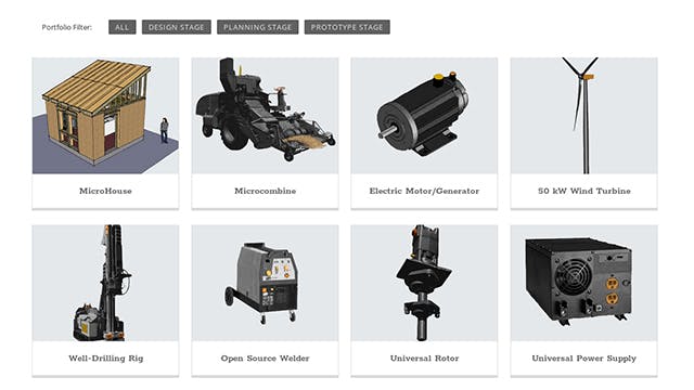 De vijftig machines zijn nog niet voltooid, maar er is al wel 95 tot 99 procent vooruitgang met projecten als de MicroTractor, Seed Eco-Home, Aquaponic Greenhouse, Open Source Hydronic Stove, Open Source PV System, Biodigester, CNC Torch Table, CEB Press, Power Cube en 3D Printer. Het zijn allemaal prototypen van machines die onmisbaar zijn op een boerderij. Het moet uiteindelijk boeren toelaten om zelf machines te maken en te repareren voor een kostprijs die veel lager ligt dan wat ze nu moeten betalen.