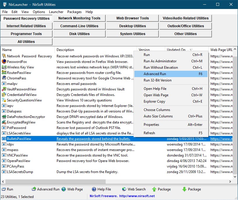 NirSoft heeft een suite met meer dan 250 tools voor je klaarstaan. We bekijken er zestien. Je vindt ze op nirsoft.net/utils, netjes opgedeeld in rubrieken, zoals Password Tools, System Tools, Browser Tools en Network Tools. De meeste tools zijn beschikbaar voor Windows 32 en 64 bit. Voor de meeste tools zijn bovendien diverse taalbestanden beschikbaar, waaronder Nederlands (Dutch).