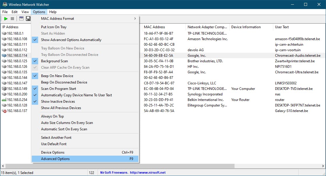 Ondanks de naam van de tool werkt dat ook voor apparaten die via een ethernetkabel met je netwerk zijn verbonden. Je krijgt meteen een lijst te zien met de apparaatnaam, de fabrikant, het ip-adres en het MAC-adres. Via Options / Advanced Options kun je de netwerkadapter kiezen en het ip-bereik aangeven waarbinnen de tool moet scannen (bijvoorbeeld 192.168.1.100 tot 192.168.1.254).