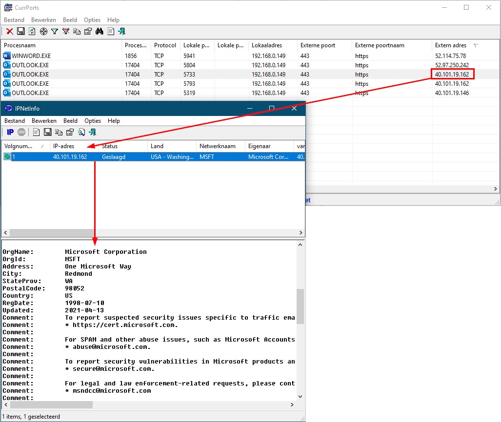 Wil je meer weten over de herkomst van een verbinding, zorg dan dat je ook de tool IPNetInfo hebt opgestart. In NirLauncher is die te vinden in de rubriek Internet Related Utilities. Vervolgens klik je in CurrPorts met rechts op een item en kies je IPNetInfo van NirSoft. Je krijgt nu allerlei informatie (via een whois-query) te zien over wie achter het externe ip-adres schuilt.