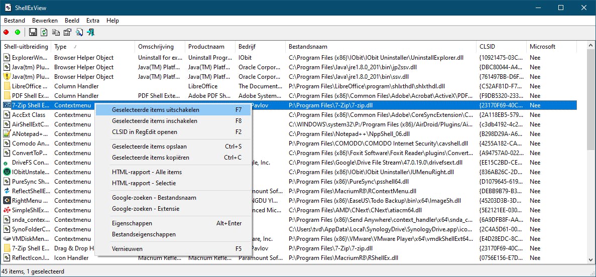 Als je inderdaad problemen hebt, dan los je die op met ShellExView, in NirLauncher via de rubriek System Utilities. Meteen na het opstarten krijg je een hele reeks zogenoemde shell-uitbreidingen te zien. Bij ons waren dat er meer dan driehonderd. Het werkt doorgaans het handigst wanneer je die sorteert op de kolom Type. Of je kiest Extra / Op uitbreidingstype filteren en je selecteert alleen de types waarin je geïnteresseerd bent.