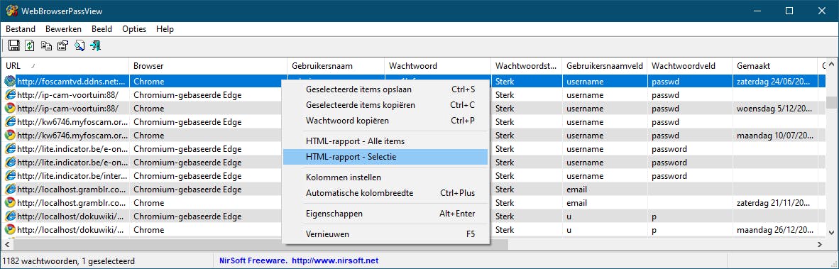 Om het gedownloade zip-bestand uit te pakken, heb je het wachtwoord wbpv28821@ nodig. Zodra je WebBrowserPassView opstart, laat die alle wachtwoorden zien die in je browsers zijn gevonden, inclusief URL, Browser, Gebruiksnaam, Wachtwoord en Bestandsnaam. Klik met rechts op een selectie en kies HTML-rapport – Selectie om de wachtwoorden in een overzichtelijke lijst in je browser te bekijken.