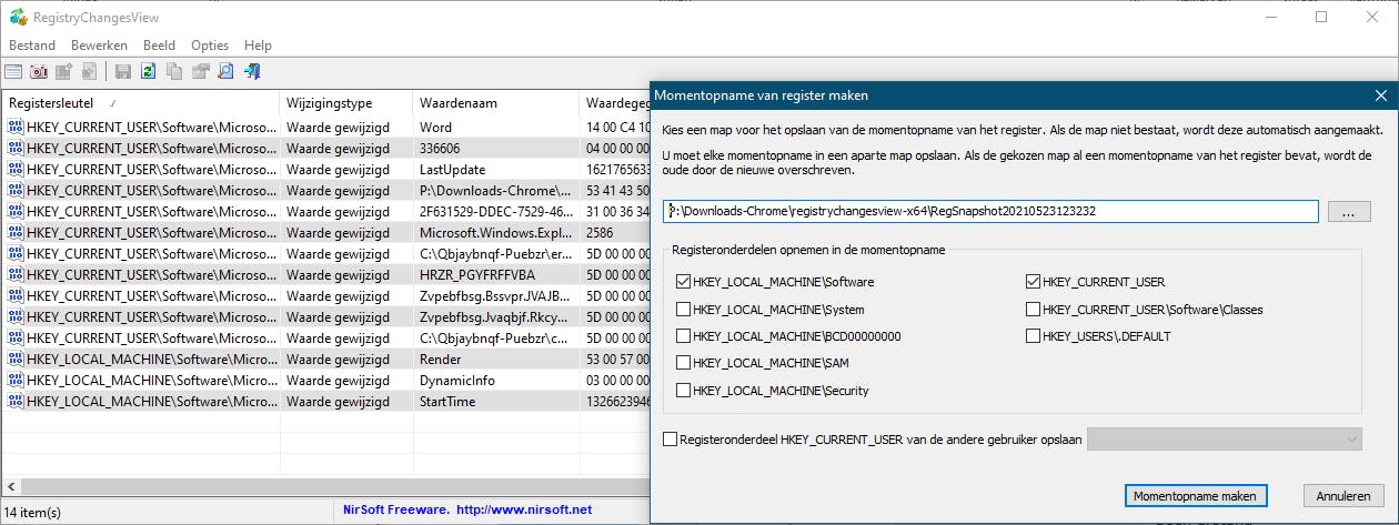 Programma’s (en malware) kunnen niet alleen bestanden benaderen, maar ook allerlei wijzigingen aanbrengen in het Windows-register. Deze database bevat tenslotte talloze instellingen voor allerlei applicaties en hardwarecomponenten. De tool RegistryChangesView laat zien welke registerwijzigingen er precies zijn doorgevoerd.