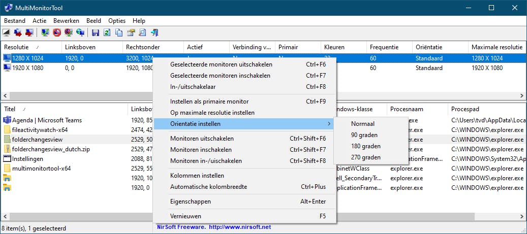 Heb je twee (of meer) monitors op je systeem aangesloten, dan kan tenslotte de MultiMonitorTool van pas komen. Het programmavenster is opgedeeld in twee vensters. Bovenaan staan de beeldschermen in een lijst. Onderaan zie je de eigenschappen van het geselecteerde beeldscherm, inclusief geopende vensters met allerlei details.