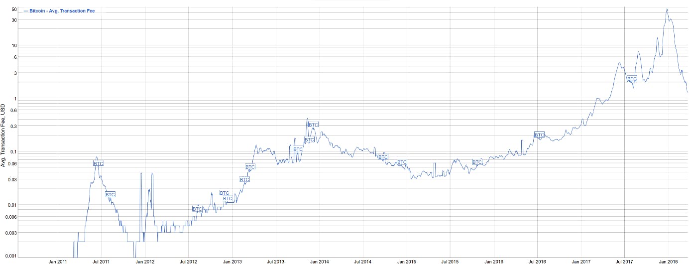 Bitcoin-transacties zouden goedkoop zijn. Lange tijd was dat inderdaad het geval. Zo schommelde in 2011 de gemiddelde kosten van een transactie onder de cent. In de loop der tijd zijn de gemiddelde kosten van bitcoin-transacties sterk gestegen. Vlak voor de jaarwisseling kostte een transactie zelfs tot 55 dollar. Op het moment van schrijven is een transactie weer een stuk goedkoper, namelijk rond de 2 dollar.