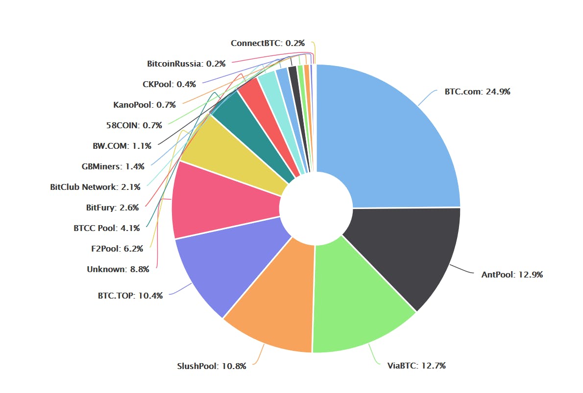 De grootste mining pool op dit moment is BTC.com. Deze pool heeft een ‘marktaandeel’ van ongeveer 25 procent. De drie grootste pools vinden samen meer dan 50 procent van alle blocks en dat geeft ze erg veel macht. Bij grote veranderingen in het Bitcoin-protocol moet namelijk een meerderheid van de miners de verandering accepteren. De leiders van mining pools bepalen dus in grote mate de toekomst van Bitcoin. Bovendien maken sommigen zich zorgen dat mining pools kunnen samenwerken en een zogenaamde 51-procentaanval kunnen uitvoeren. Bij een 51-procentaanval is er een miner die meer dan 50 procent van de blocks vindt. Het risico is dat de miner bitcoin-transacties ongedaan kan maken. Hierdoor kan de kwaadwillende miner bitcoins meerdere keren uitgeven.