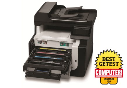 De HP LaserJet Pro CM1415fn vinden wij qua uiterlijk erg aantrekkelijk. De blikvanger van de printer is een 3,5inch-aanraakscherm (8,89 cm). U zult het met dit scherm moeten doen, want andere bedieningsknoppen heeft HP niet aangebracht. Interessant is dat de LaserJet Pro CM1415fn geschikt zal zijn voor de consumentenversie van HP’s ePrint waarmee u afdrukken per e-mail naar de printer kunt sturen. Helaas had HP op het moment van testen nog geen ePrint-firmware voor de printer beschikbaar en konden we dit niet testen. Opvallend is dat het stuurprogramma geen conceptmodus of andere voorzieningen heeft om toner te besparen. Ook de afdrukkwaliteit van een fotoafdruk kan niet worden gewijzigd, wel kunnen er aanpassingen in de kleur worden gemaakt. De afdrukken die de printer voortbrengt zijn goed. Wel zijn de kleuren die de HP produceert net even iets te levendig neergezet, waardoor vooral in de donkere delen van een foto detail verloren gaat. Intern lijkt de printer erg veel op de eveneens geteste Canon iSensys MF8050Cn, toch zijn de vrijwel identieke tonercartridges door net een ander palletje niet uitwisselbaar. De printer heeft een aantal ingebouwde handigheidjes. Zo kunt u vanaf de printer een aantal soorten ‘speciaal’ papier afdrukken zoals muziekpapier of gelinieerd papier. De afdrukkosten voor een zwart-wit-afdruk zijn voordat we afronden op centen, het hoogste van de test. Ook een kleurafdruk is met 17 cent per afdruk relatief prijzig. Iets dat negatief opvalt, is de afdruksnelheid.