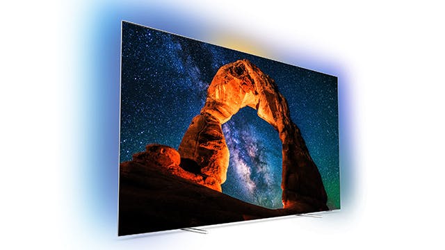 Nog een Philips-model, want naast de 903-reeks bracht het merk afgelopen najaar ook de 803-serie met vergelijkbare specificaties op de markt. Het betreft een televisie zonder soundbar van Bowers & Wilkins, waardoor dit product interessant is voor filmfanaten die al in het bezit zijn van een prima audio-opstelling. Toch is er voor Philips-begrippen een relatief krachtig luidsprekersysteem met een totaal uitgangsvermogen van 50 watt in de onderzijde verwerkt.