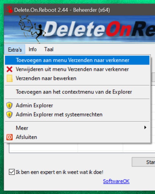 Meteen daarna kun je Delete.On.Reboot installeren, starten en Nederlandstalig instellen, waarbij je tevens aangeeft dat je een expert (…) bent die weet wat-ie doet. En dat is nog niet alles, want via de menu-opties Extra’s en Toevoegen aan menu Verzenden naar verkenner zorg je voor een Delete.On.Reboot-integratie met Windows Verkenner.