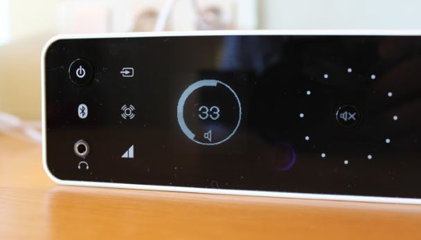 Eigenlijk is de bedienings-/versterkingsunit best onhandig op een bureau, omdat deze redelijk wat plek inneemt. Gelukkig is het mogelijk het paneel verticaal op de bijgeleverde standaard te plaatsen, waardoor dit minder ruimte inneemt. Het schermpje draait mee, waardoor alle informatie ook verticaal af te lezen is. De knoppen zijn echter gericht op horizontaal gebruik, maar dit is verder niet hinderlijk. Het is wel jammer dat het display te klein is om informatie te tonen over de muziek die je luistert. Nu is de scherminformatie beperkt tot het volumeniveau en welke bron er actief is.