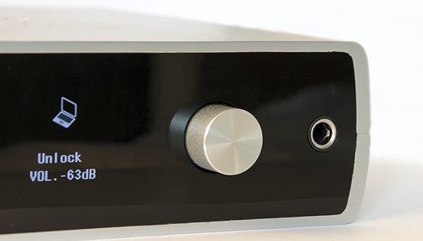 De glazen voorkant is voorzien van slechts drie bedieningsknoppen: de aan/uit-knop, een tiptoets voor het selecteren van de bron en een volumeknop. Dit is dan ook meer dan voldoende om je DAC te bedienen. Opvallend is wel dat de volumeknop alleen werkt voor de hoofdtelefoon die je aan de voorkant kan inpluggen. Deze aansluiting is daarnaast niet geschikt voor je gewone 3,5mm-aansluiting die je gewend bent van bijvoorbeeld je telefoon, maar werkt alleen met een grote plug. Wil je de DAC niet gebruiken in combinatie met een hoofdtelefoon dan is de volumeknop dus nutteloos, terwijl deze wel vrij prominent aanwezig is.
