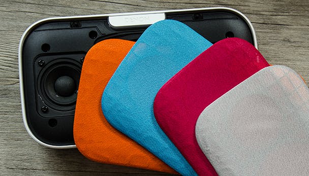 Het is wel weer leuk dat je de kleur van de speaker zelf kan aanpassen. Je krijgt namelijk vier verschillende kleuren stof mee die je achter de behuizing kan plaatsen. Zo kan je nog eens wisselen van kleur. Verder is de behuizing te verkrijgen in een witte en zwarte variant.
