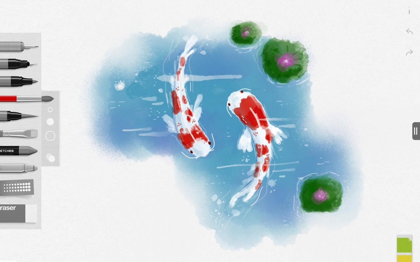 De makers van Tayasui Sketches hebben met hun tekenprogramma een app willen maken die niet alleen heel erg goed werkt en mooie resultaten oplevert, maar vooral ook een app die helemaal zen is. Dit houdt in dat je op je scherm niks ziet dat je afleidt. Geen rijen met icoontjes, maar juist een lekker leeg scherm waar je ongestoord op kunt kliederen. Mocht je wel een optie nodig hebben, dan kun je deze zeer snel oproepen. Bij Tayasui Sketches willen ze niet dat je uit je flow wordt gehaald tijdens het tekenen en dat je jezelf helemaal kunt concentreren op datgene waar het om gaat, een mooi kunstwerk maken.