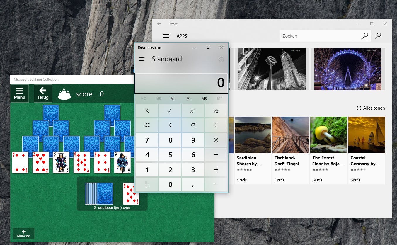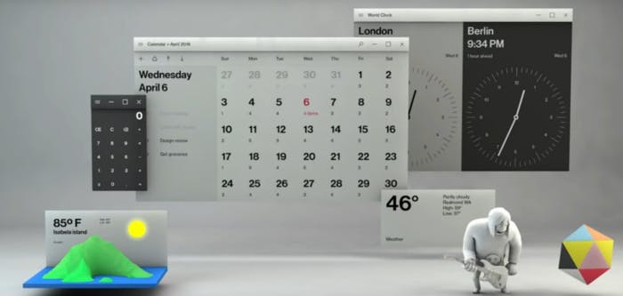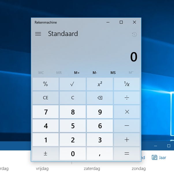 Niet alleen de interface van Windows 10 zelf maakt gebruik van Fluent, dat geldt ook voor de apps die onder Windows 10 zijn geïnstalleerd. Bijvoorbeeld de Rekenmachine, hier wordt gebruik gemaakt van een Acryl-achtig uiterlijk, waarbij de kleuren en transparantie van het venster zich automatisch aanpassen aan de omgeving op het bureaublad en de apps die open staan.