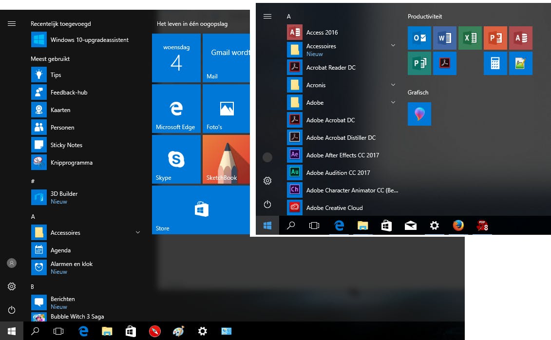 De manier waarop het Windows 10 Startmenu is opgebouwd is met de Fall Creators Update veranderd. Niet direct zichtbaar wellicht, maar als je goed kijkt zie je dat de achtergrond van het menu wel degelijk is veranderd. Voorheen was deze namelijk transparanter, waardoor je duidelijker het achterliggende venster of het bureaublad kon zien. In de Fall Creators Update is de achtergrond minder transparant, en zijn de vensters erachter van een waas voorzien.