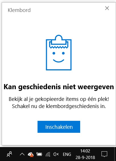 Het nieuwe klembord is standaard uitgeschakeld. Om het in gebruik te nemen druk je tegelijk de Windows-toets en V in. Je krijgt dan een venstertje in beeld waarin wordt gevraagd of je Klembordgeschiedenis wilt inschakelen. Klik met de muis op Inschakelen en je beschikt ineens over veel meer mogelijkheden voor knippen en plakken.