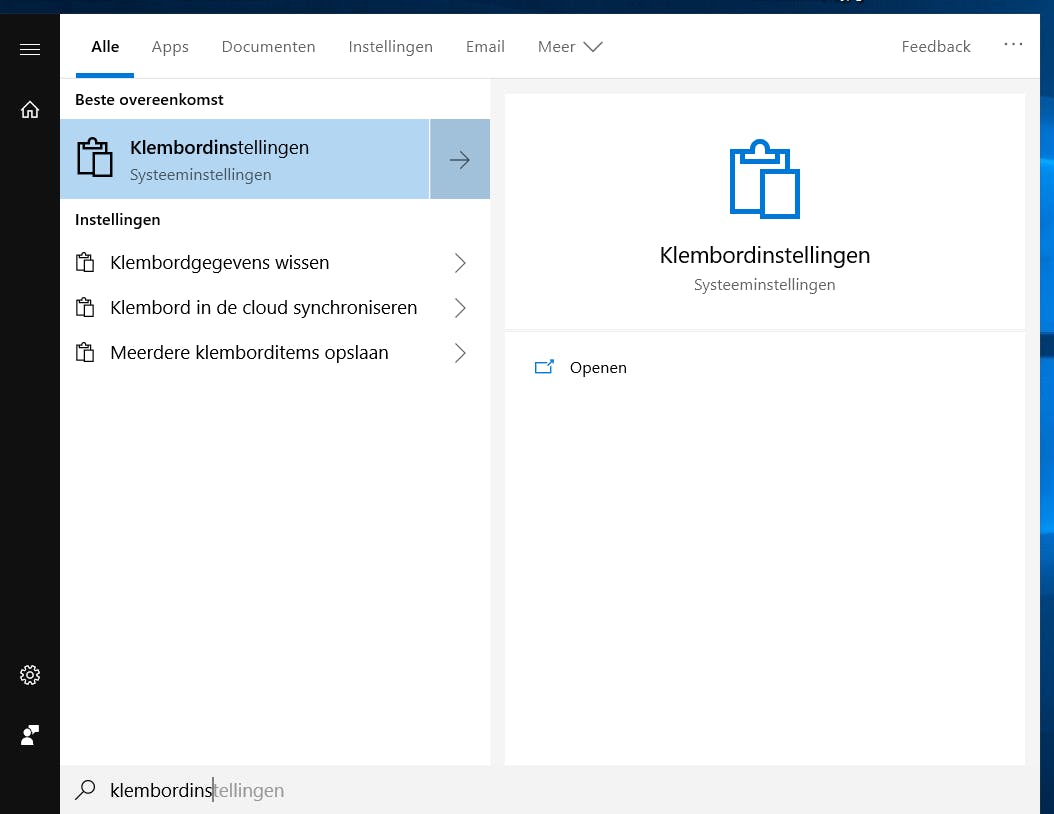 Het delen met andere computers kun je inschakelen via de instellingen van het hulpprogramma. Klik op het vergrootglas links onderin het scherm van Windows en typ Klembordinstellingen. Klik dit woord aan in het venster dat opent.