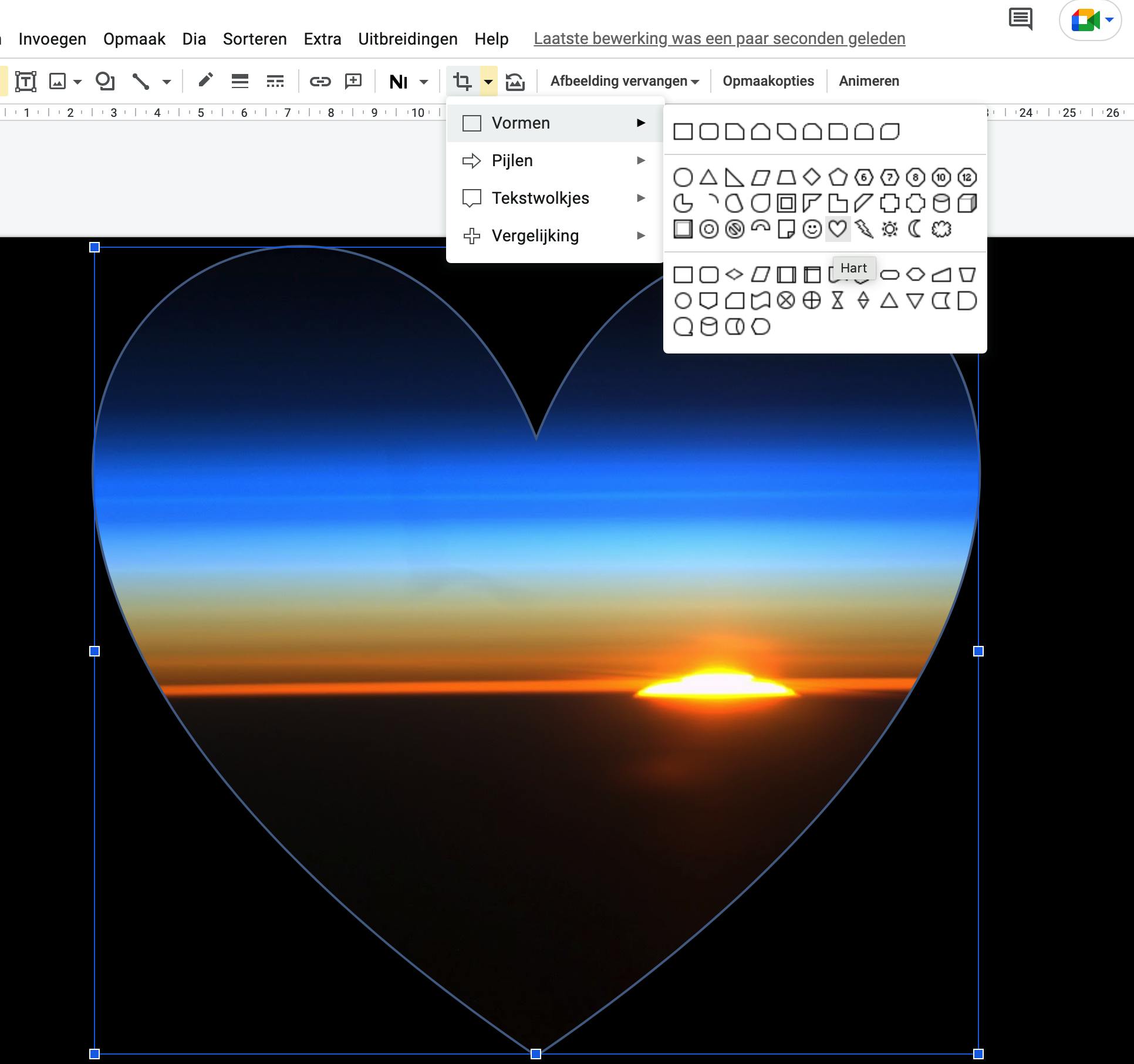 Een afbeelding is per definitie rechthoekig of vierkant. Wil je de afbeelding uitsnijden in een cirkel, een pijl, een driehoek of in een van de vele andere vormen, dan kun je de afbeelding maskeren. Zorg dat je de afbeelding selecteert, zodat je de acht handvaten om het plaatje ziet. Daarna zoek je in de knoppenbalk het gereedschap Afbeelding bijsnijden. Naast deze knop vind je een pijltje dat naar beneden wijst. Klik erop, dan kom je bij de verschillende maskervormen. Dat het om een masker gaat, merk je wanneer je daarna nog een andere vorm wilt gebruiken. Google Presentaties zal de nieuw gekozen vorm telkens op de oorspronkelijke afbeelding toepassen.