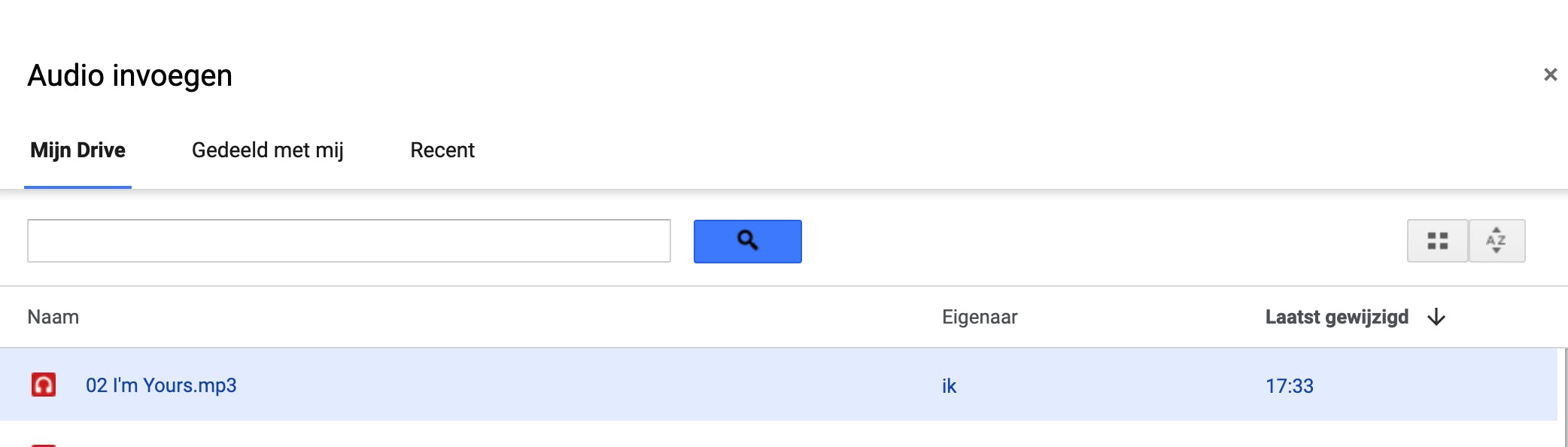 Audio toevoegen in Google Presentaties is lang een gedoe geweest. Nu gebruik je gewoon de opdracht Invoegen / Audio. Het audiobestand moet wel op je Google Drive staan. Het maakt niet uit of het achtergrondmuziek is of een spraakopname voor een leersessie, zolang de audiobestanden maar in de mp3- of wav-indeling zijn. Heb je het audiobestand nog niet geüpload naar Google Drive, dan open je je account en je klikt op de knop Nieuwe in de linkerbovenhoek van het venster. Vervolgens kies je Bestand uploaden om het geluidsbestand te selecteren.