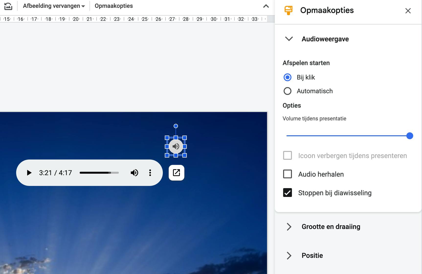 Nadat het geluidsbestand is geüpload, ga je weer naar je presentatie en dan kies je Invoegen / Audio. Er verschijnt dan een grijs luidsprekerpictogram op de dia. De grootte van dit pictogram is aanpasbaar. Je kunt het pictogram ook naar een andere plaats slepen. Onder het luidsprekertje vind je de opties voor afspelen/pauzeren en volume. Als je met rechts op het luidsprekertje klikt, kun je de opdracht Opmaakopties selecteren. Hierdoor zal aan de rechterkant een balk verschijnen met alle opties voor de audioweergave. Je bepaalt of het geluid automatisch moet starten of nadat je erop hebt geklikt. Je regelt het volume en je kiest of de audio moet stoppen bij de diawissel of dat de audio gewoon moet doorlopen. Je kunt het pictogram verbergen tijdens de presentatie. Deze optie is alleen beschikbaar als je hebt gekozen om het geluid automatisch op te starten. En het is zelfs mogelijk om de audio eindeloos te herhalen.