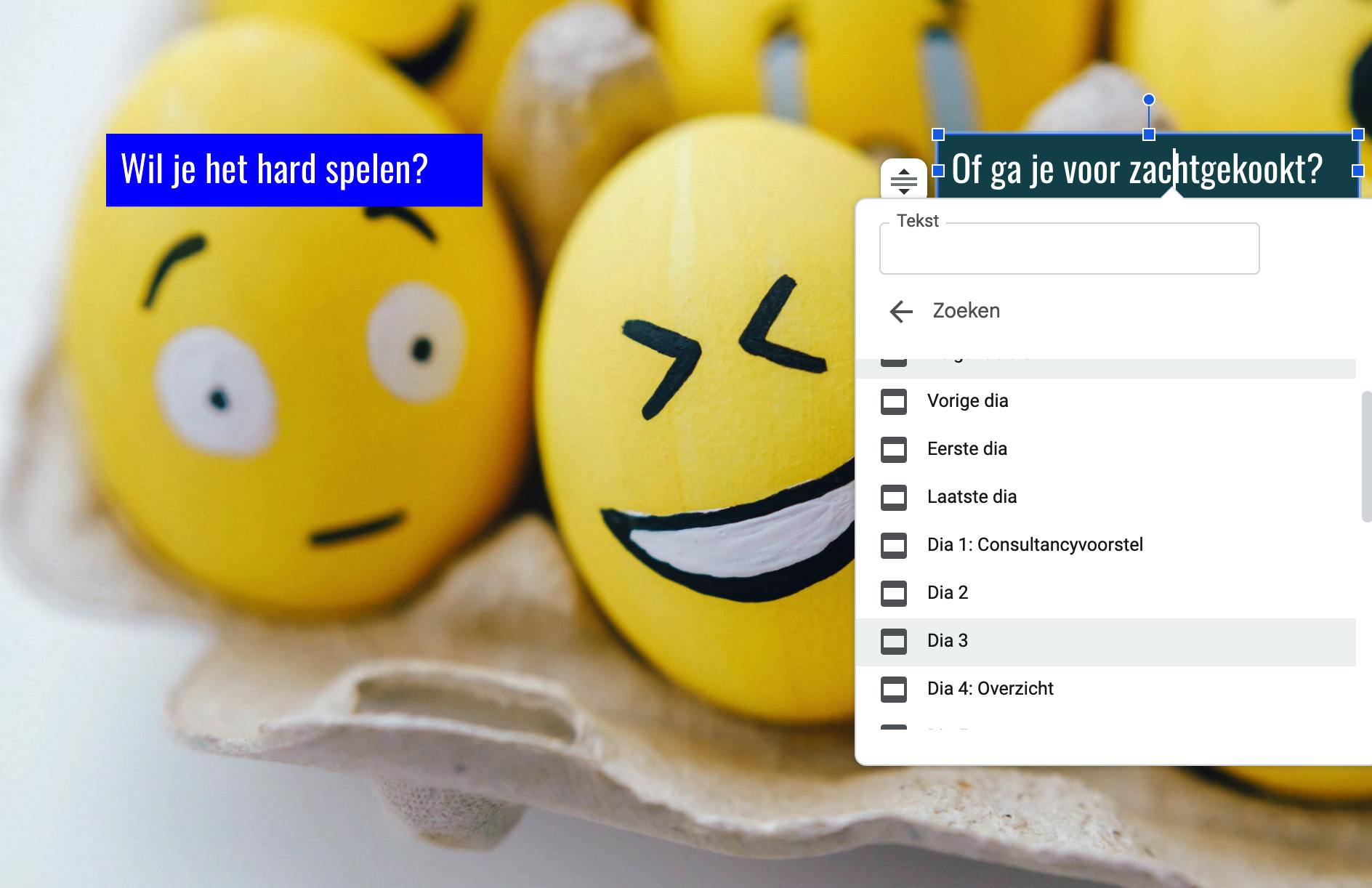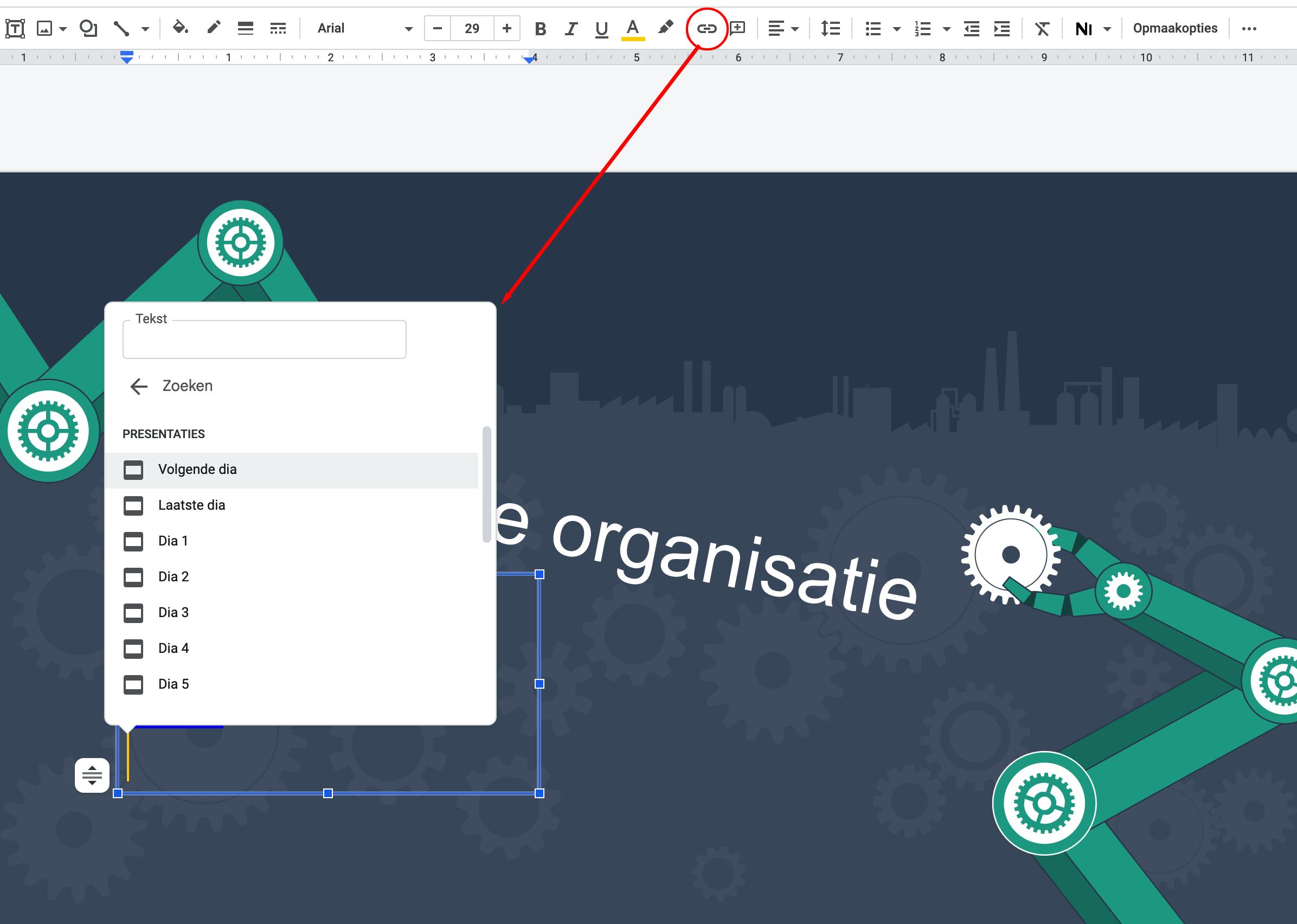 Een presentatie verloopt niet altijd rechtlijnig. Soms wil je vanaf dia 7 terug naar dia 2, waar bijvoorbeeld een overzicht staat. Hiervoor moet je dia’s met een link aan elkaar koppelen. Plaats de muisaanwijzer in het tekstvak waar je deze koppeling wilt toevoegen en klik op de knop met het kettinkje, Link invoegen. Er verschijnt dan een pop-up waarin je aangeeft welke dia er moet volgen wanneer je op de link klinkt.