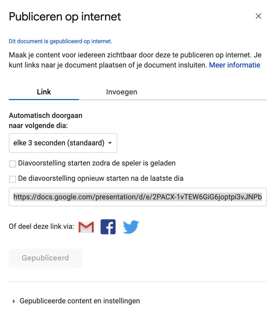 Als de presentatie in de cloud is opgeslagen, is het niet moeilijk om hem online te delen. Ga naar Bestand / Delen / Publiceren op het web. Hierdoor verschijnt er een pop-up waarin je de keuze hebt tussen twee mogelijkheden. Wil je een link ontvangen die je kunt doorsturen naar de mensen die de presentatie mogen bekijken? Of wil je de presentatie invoegen in een bestaande website? Laten we eerst uitgaan van het tabblad Link. Dan kies je het aantal seconden dat iedere dia in beeld komt. Er is ook een optie om de presentatie in een lus te laten draaien. Als je deze keuze bevestigt, ontvang je een link die je rechtstreeks kunt delen via Gmail, Facebook of Twitter. Wil je de presentatie embedden op een website, dan ontvang je de code die je kunt kopiëren en plakken in de editor waarmee je de website onderhoudt.