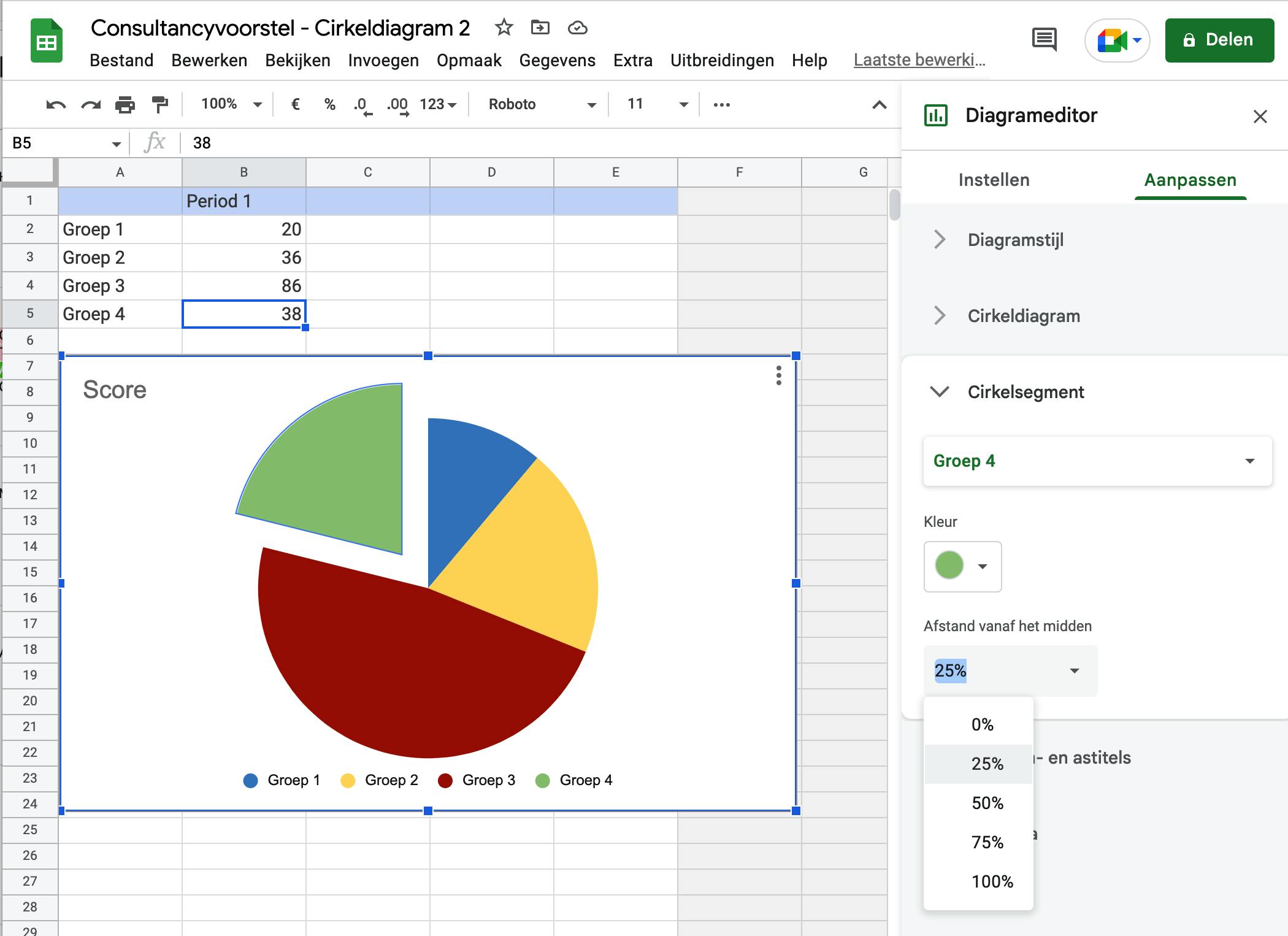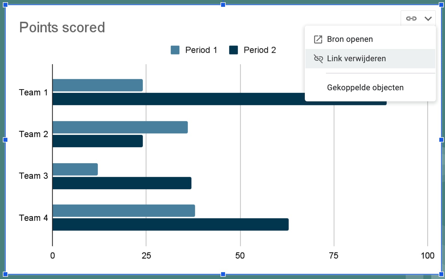 Vanaf nu kun je de grafiekgegevens of het uiterlijk van de grafiek aanpassen door de gegevens in Google Spreadsheet te openen en daar de bewerking uit te voeren. De snelste weg daarnaartoe is trouwens het pijltje in de rechterbovenhoek van het diagram. Daar klik je op Bron openen. Je kunt eventueel ook rechtstreeks in Google Drive naar de spreadsheet gaan, want de naam van dit bestand komt overeen met die van de presentatie. Als je in Google Presentaties via het pijltje rechtsboven in de grafiek op Link verwijderen klikt, dan converteer je het diagram naar een statische afbeelding.