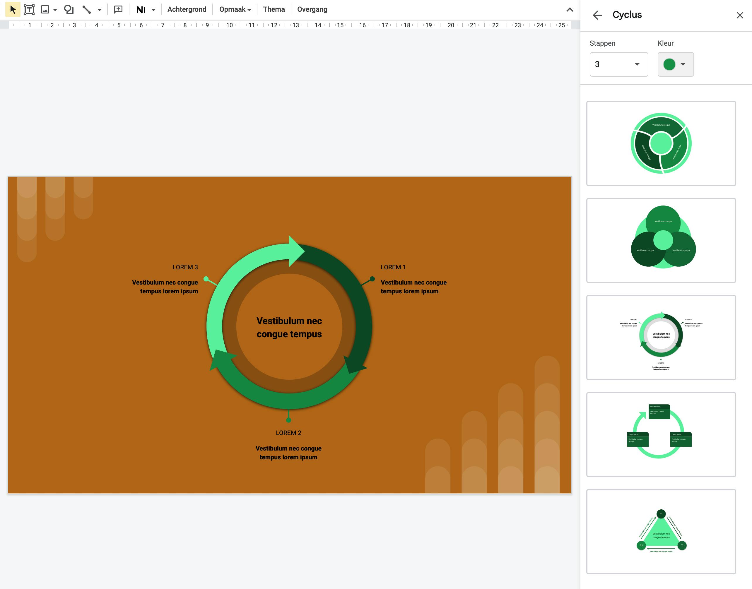 Het tweede menu-item Diagram brengt je bij een andere groep diagrammen: Raster, Structuur, Tijdlijn, Proces, Relatie en Cyclus. Die zijn geschikt om een conceptplan, een organisatie of een bepaald proces weer te geven. Hier pas je de kleuren en het aantal stappen aan via de rechterbalk. Als je bijvoorbeeld Cyclus selecteert, dan kun je het aantal stappen verhogen en verlagen door een selectie te maken in een vervolgkeuzelijst.