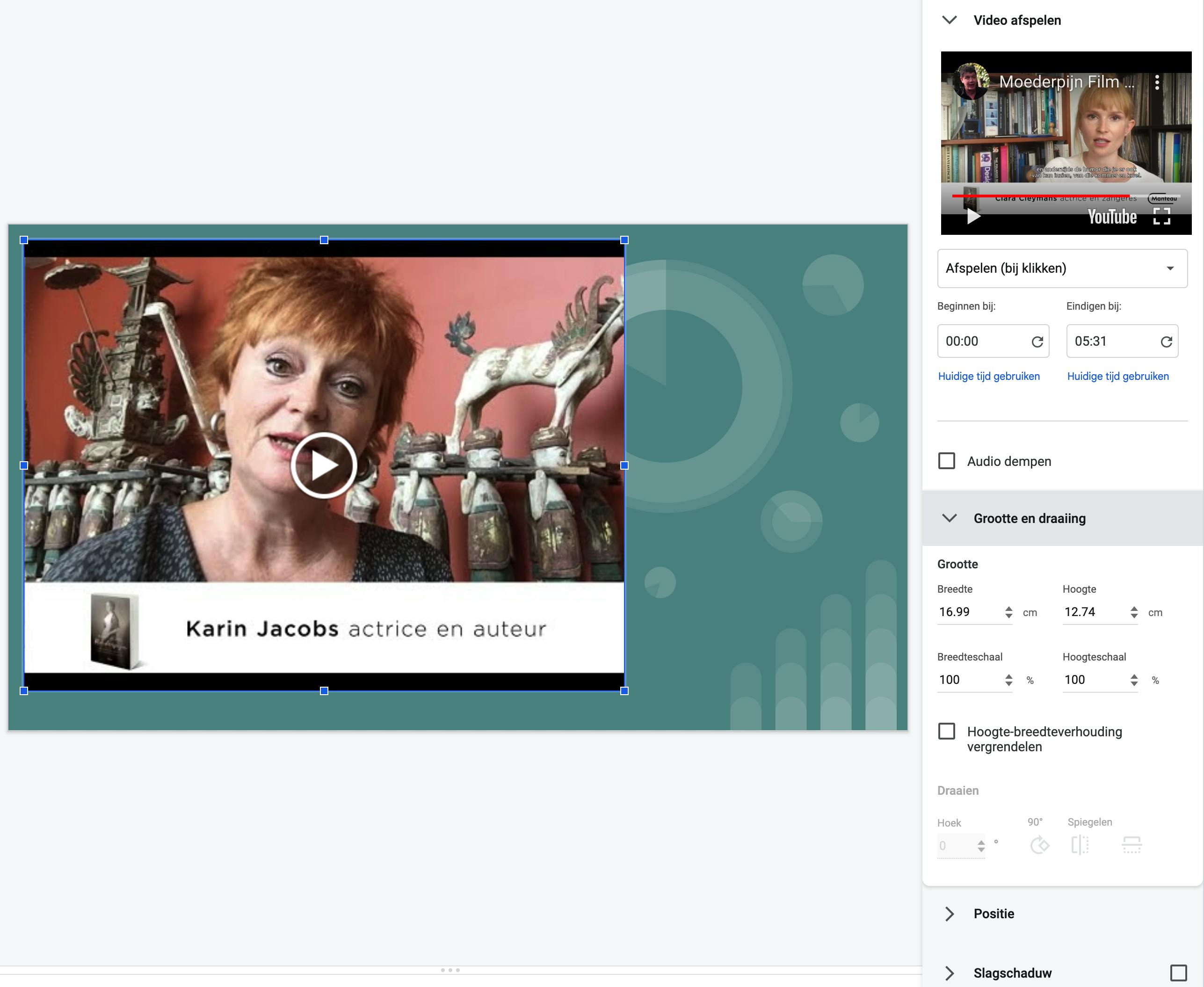 Bij lange filmpjes die je niet volledig wilt tonen geef je aan op welke tijdstip de video moet starten en wanneer hij moet stoppen. Je kunt een slagschaduw achter de video plaatsen en de positie aanpassen door de waarden voor de X- en Y-as handmatig in te voeren. Omdat Google Presentaties wijzigingen automatisch opslaat, hoef je niets hoeft te doen om de wijzigingen vast te leggen voor de presentatie.