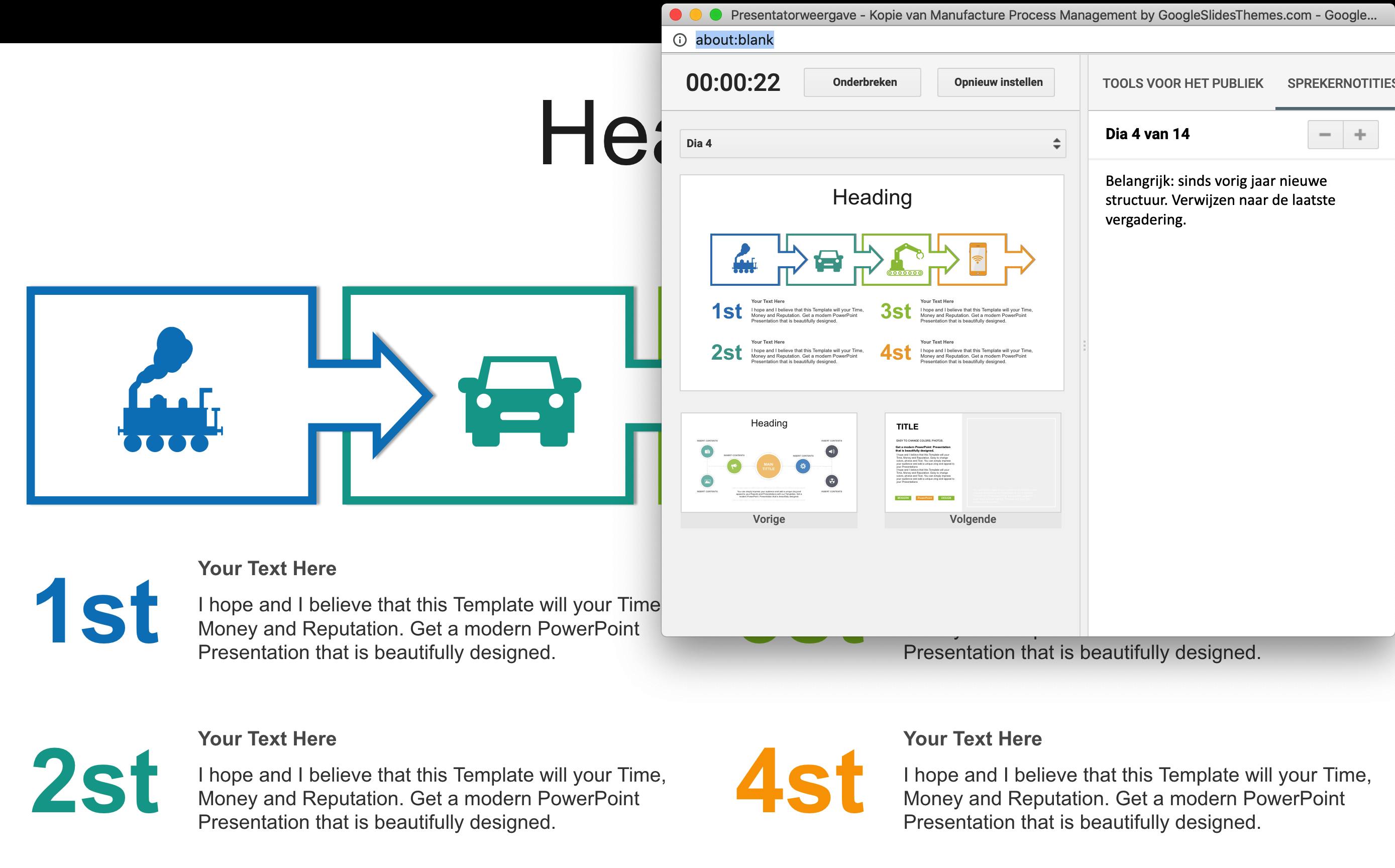 Op het moment dat je de presentatie via een beamer of externe monitor laat zien aan het publiek, klik je rechtsboven op de knop Diavoorstelling. Nog beter is het pijltje ernaast, waarmee je de Presentatorweergave activeert. In deze weergavemodus lees je informatie die het publiek niet te zien krijgt. Zo zie je in een oogopslag wat de volgende dia zal worden. Een timer geeft aan hoelang je ondertussen bezig bent. Je kunt de presentatie vanuit deze modus onderbreken en voortzetten. En het belangrijkste zijn de Sprekersnotities. Tijdens de voorbereiding noteer je hier de steekwoorden als geheugensteuntje voor je presentatie.
