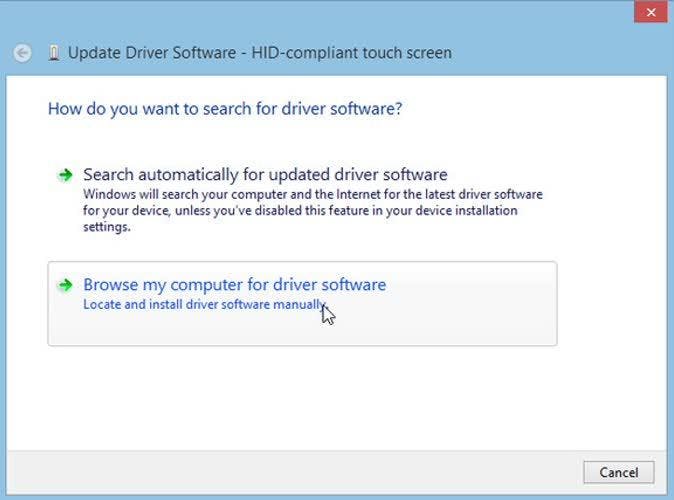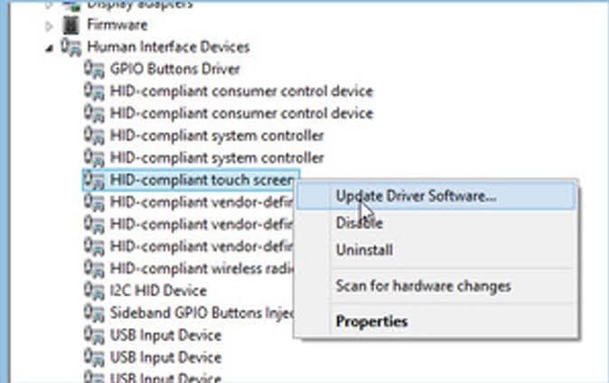 Nog steeds niet goed? Het is tijd om te proberen om drivers opnieuw te installeren. In de Search Charm typ je device manager en selecteer je Device Manager. Open het Human Interface Devices-gedeelte. Zoek het aanraakscherm op; het heet waarschijnlijk HID-compliant touch screen. Klik er met de rechtermuisknop op.