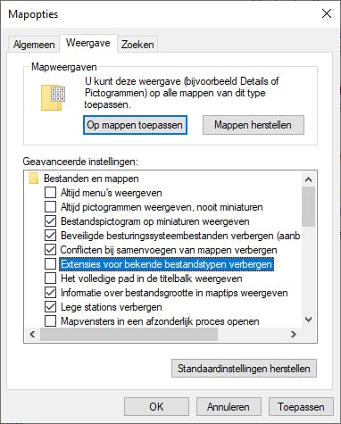 Zie je wel bestandsnamen maar geen extensies, dan is de weergave daarvan uitgeschakeld. Logisch, want Windows schakelt dat standaard uit, al is dat gezien de veiligheid niet erg handig. Om de weergave van de extensies in te schakelen, open je Windows Verkenner. Klik dan op Bestand / Map en zoekopties / Weergave en haal in de lijst met opties het vinkje weg bij Extensies voor bekende bestandstypen verbergen.