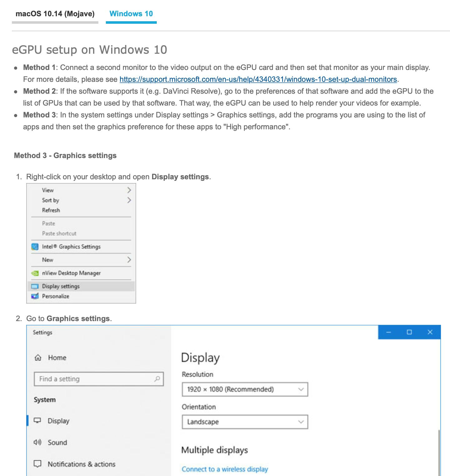 Hoe je het meeste uit je nieuw aangesloten externe videokaart kunt halen, hangt af van welke software je gebruikt en op welk systeem je dit doet. Sommige programma’s kunnen volledig gebruik maken van je externe gpu, andere programma’s kunnen dit niet of maar gedeeltelijk doen. Het is ondoenlijk om hier precies te vertellen welke stappen je moet ondernemen, maar in de meeste gevallen moet je in bijvoorbeeld de video-render-software of game instellen dat de externe gpu bepaalde taken voor zijn rekening moet nemen. Googel naar je combinatie van laptop, software en externe gpu om de beste instellingen voor je systeem te vinden. Naast de website www.egpu.io kun je ook terecht op Reddit of op het forum van NotebookReview. Vergeet voor Windows 10 ook niet de juiste driver te installeren, je vind deze informatie in de handleiding van je externe gpu.