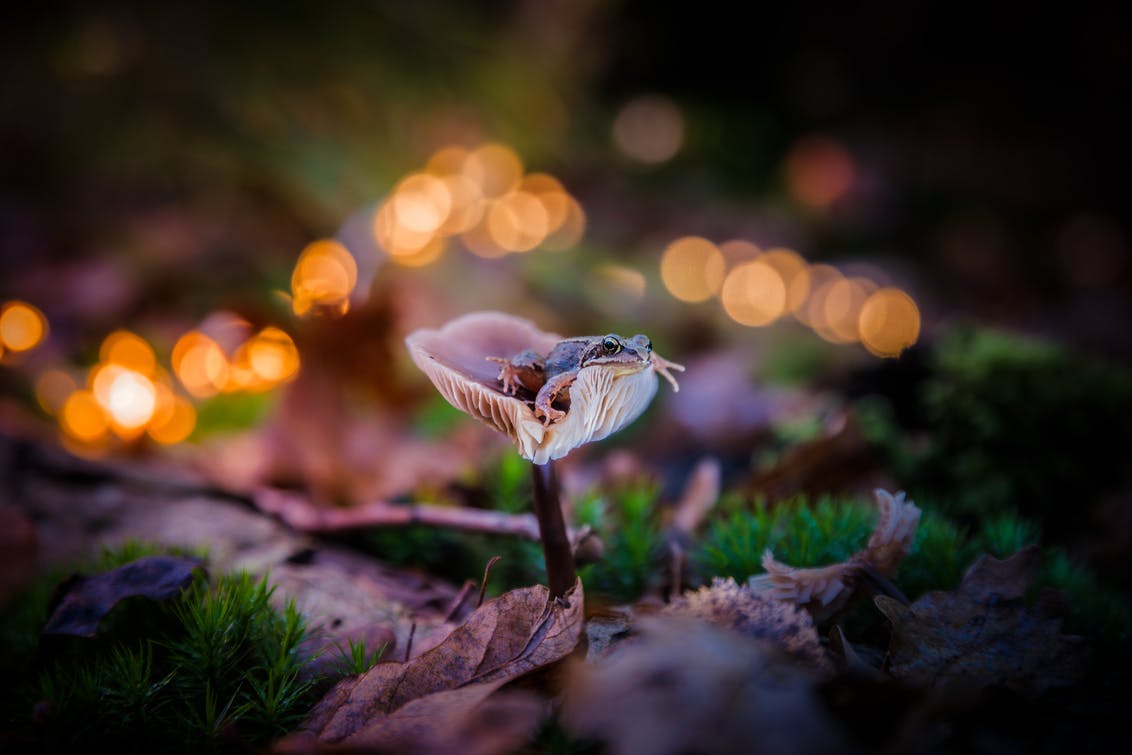 Zucht... Hier worden we inderdaad een beetje stil van. Want hoe vaak zie je nou een kikker in een paddenstoel? Maar over de rest van de foto is ook goed nagedacht. De herfstbladeren op de voorgrond, het gras door de foto heen, en de bokeh op de achtergrond. De donkere hoeken zorgen ervoor dat het hoofdonderwerp er prachtig uitkomt.