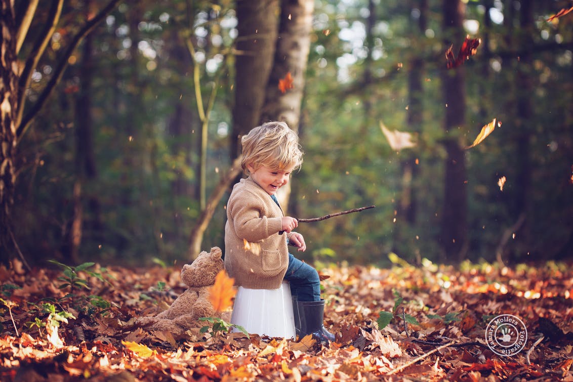 Ook voor kinderen kan de herfst een speeltuin zijn. En veel heb je dan niet nodig om jezelf te vermaken. Een omgekeerde emmer, een knuffelbeer, een tak, en een hele hoop bladeren zijn genoeg voor een wijde glimlach.