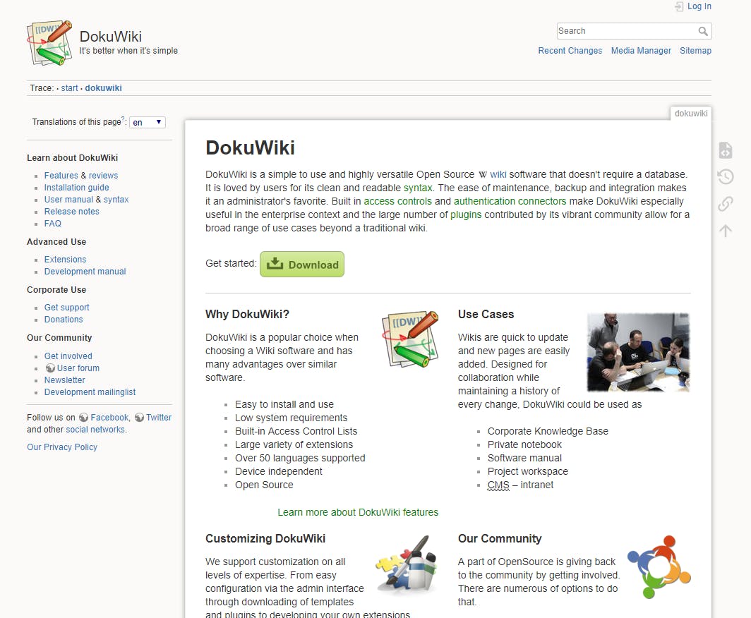 Als je graag artikelen of blogs publiceert, dan is een cms als WordPress, Joomla! of Drupal zeer geschikt. Ben je meer op zoek naar een site als Wikipedia, dan is een dergelijk cms niet de beste keuze. Theoretisch kun je er wel een wiki mee bouwen, maar dat is complex en onnodig, want er zijn pakketten die daarin gespecialiseerd zijn. DokuWiki is daar eentje van. Het interessante van het installeren van een pakket als dit, is dat je in vergelijking met een blog weinig grafische opties hebt en er weinig te configureren valt (afgezien van paginarechten, beheerders, enzovoort). Immers, WikiPedia is ook ooit begonnen met één pagina en van daaruit uitgebouwd tot de immense informatiebron die het nu is. Zo ga jij (en de mensen die je helpen) ook te werk. De installatie is vrij eenvoudig en daarna kun je meteen aan de slag met het aanmaken van pagina’s. Bouwen is dus eenvoudig, maar voordat je écht een goedgevulde wiki hebt, ben je wel duizenden manuren verder.