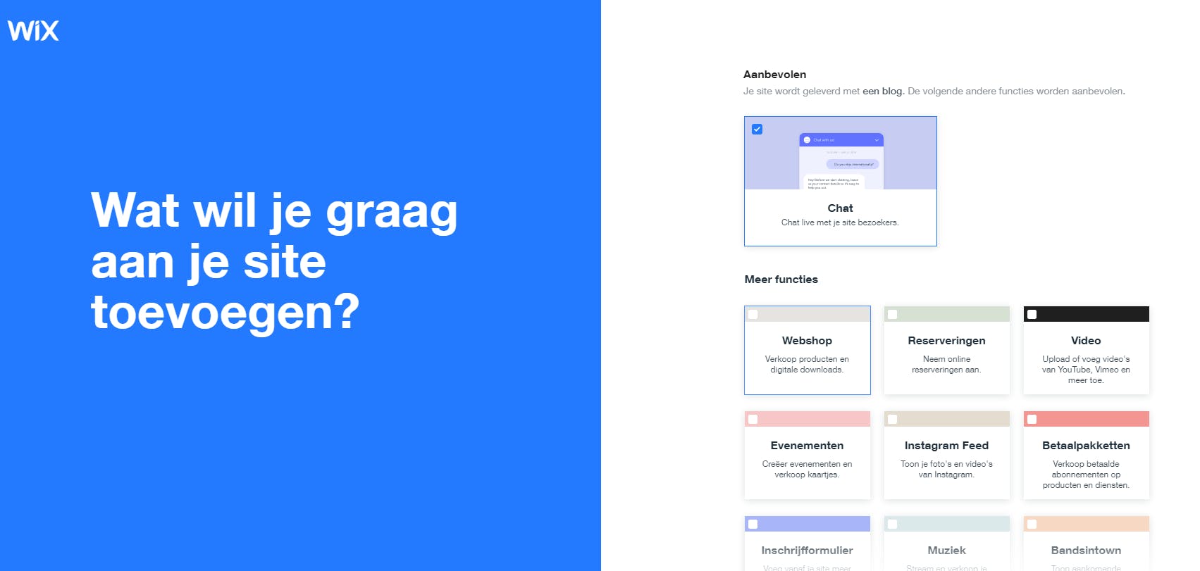 Wanneer je gezocht hebt naar manieren om je eigen website te bouwen, zul je Wix ongetwijfeld voorbij hebben zien komen in Google, of in advertenties. Het voordeel van het werken met een pakket als Wix is dat er geen installatieproces is en geen technische zaken die aan jouw kant mis kunnen gaan. Het ontwerpproces is daarbij erg gebruiksvriendelijk. Je maakt een account aan, geeft aan wat voor soort website je wil maken (bijvoorbeeld blog, webshop of restaurant), waarna je kunt kiezen om Wix aan de hand van een aantal vragen je website te laten ontwerpen of dat zelf te doen met de editor. Wij raden aan: kies voor het eerste, het is echt superhandig en je kunt alles later nog aanpassen. Je kunt daarbij zelfs afbeeldingen van een bestaande andere site of vanaf Facebook importeren. Tot slot kies je een stijl, en bam, je website is online. Werken met Wix is gratis, tot je geavanceerdere functies wilt, zoals het koppelen van je eigen domein, geen advertenties van Wix, en meer opslagcapaciteit. Pakketten variëren van 4,50 tot 24,50 euro per maand.