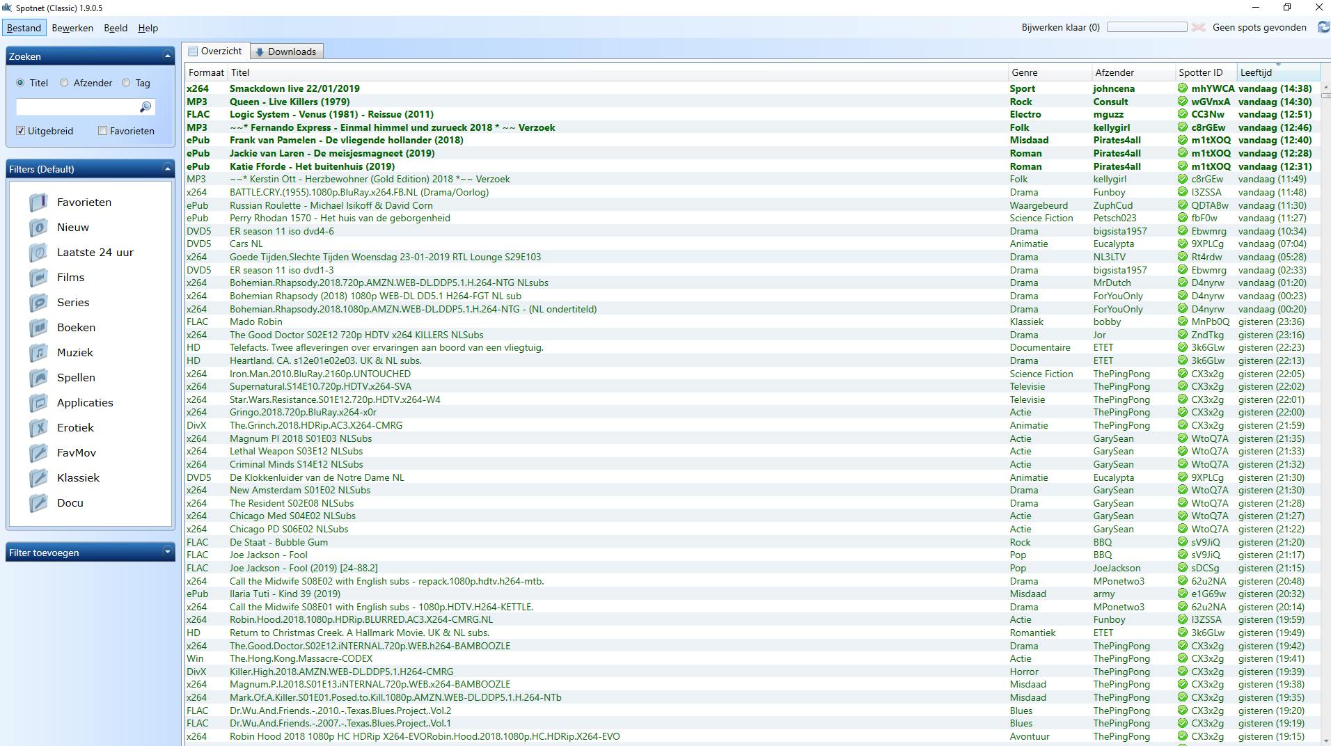 Het downloaden van muziek, series en films is nog altijd een populaire bezigheid en dat is niet gek als je bedenkt hoe pover het legale aanbod is – zeker als het om beeld gaat. Qua muziek zijn streamingdiensten behoorlijk goed gesorteerd maar de streaming-markt voor films en series is vooralsnog hopeloos incompleet en verouderd: op Netflix vind je bijvoorbeeld niet de allernieuwste bioscoopfilms of de populaire series van HBO. Downloaden via torrents blijft een optie, al hebben veel mensen officieel geen toegang meer tot The Pirate Bay, maar de nieuwsgroepen zijn ook nog altijd zeer aantrekkelijk. En om te weten wat voor moois daar dan voorbijkomt hebben we Spotnet. Nee, niet de nieuwe 2.0 maar Spotnet Classic die ook nog steeds wordt bijgewerkt en inmiddels toe is aan versie 1.9.0.5. Wie beschikt over een provider met toegang tot nieuwsgroepen of een abonnement bij een gespecialiseerde aanbieder, kan direct vanuit Spotnet van alles en nog wat downloaden wat door andere gebruikers in de nieuwsgroepen is aangetroffen (gespot) of geplaatst. Pas als er een Spotify voor films en series is, zal het fenomeen ‘downloaden’ zijn charme verliezen.