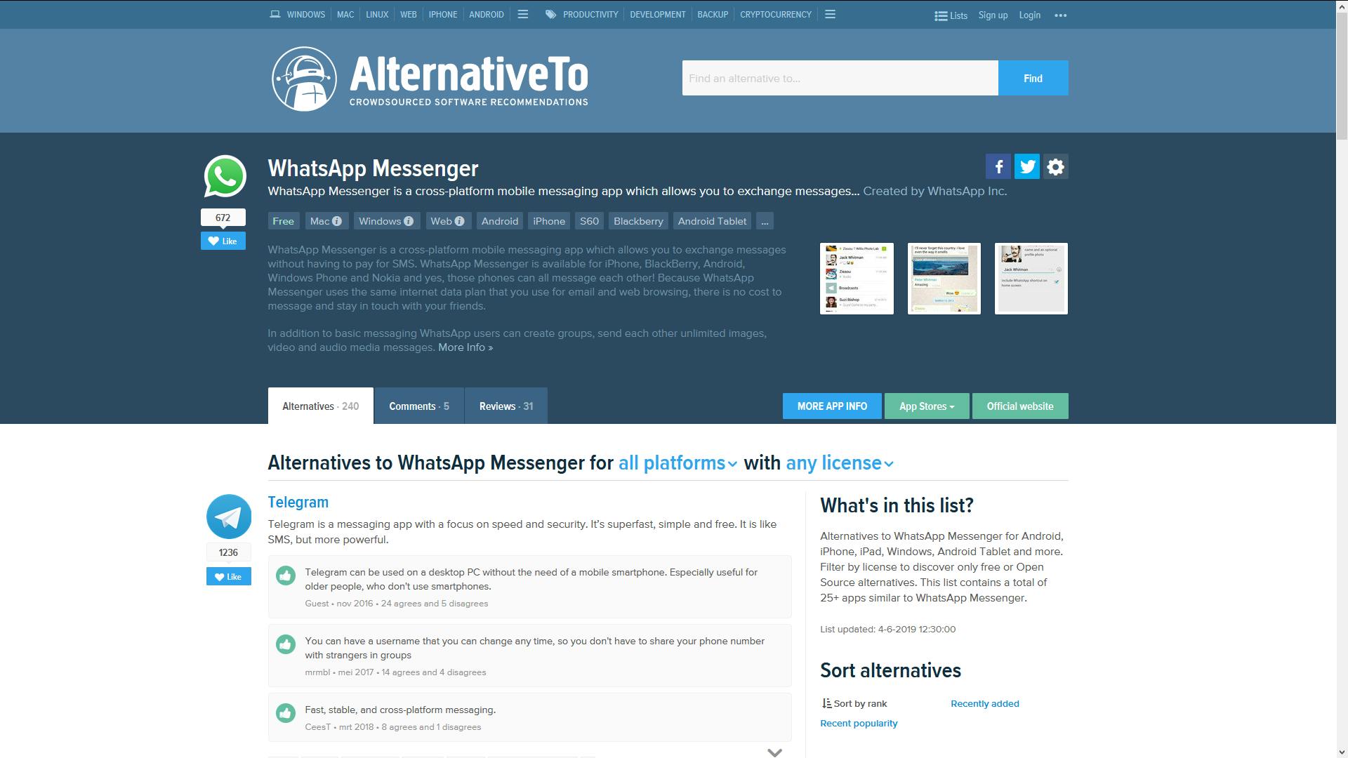 Wie na installatie van Windows 10 nog altijd niet gecharmeerd is van Edge weet natuurlijk dat er alternatieven zijn zoals Firefox, Chrome en Opera. Waar het bij browsers nog wel enigszins te overzien is, zijn er natuurlijk legio toepassingen te bedenken waarvoor alternatieven minder bekend zijn. Stel, je hebt ergens een leuk commercieel programma gezien en vraagt je af of er ook gratis alternatieven van zijn. Of je begint de privacyschendingen van Facebook zat te worden, maar wil toch met de wereld delen wat je bezighoudt. Zijn er dan alternatieve sociale platforms? Of je hebt gehoord over een leuk of handig gratis programma, maar weet niet of het wel de moeite van het installeren waard is. Voor al die situaties is er de handige site www.alternativeto.net. Hier kun je zoeken naar alternatieven voor allerlei programma’s en apps en de resultaten kun je filteren op licentie en besturingssysteem. Heb je een lijstje met interessante alternatieven samengesteld, dan laat de site vaak ook nog gebruikersrecensies en eventuele prijsinformatie zien. Kortom: een uitstekende plek om leuke (gratis) software te vinden.