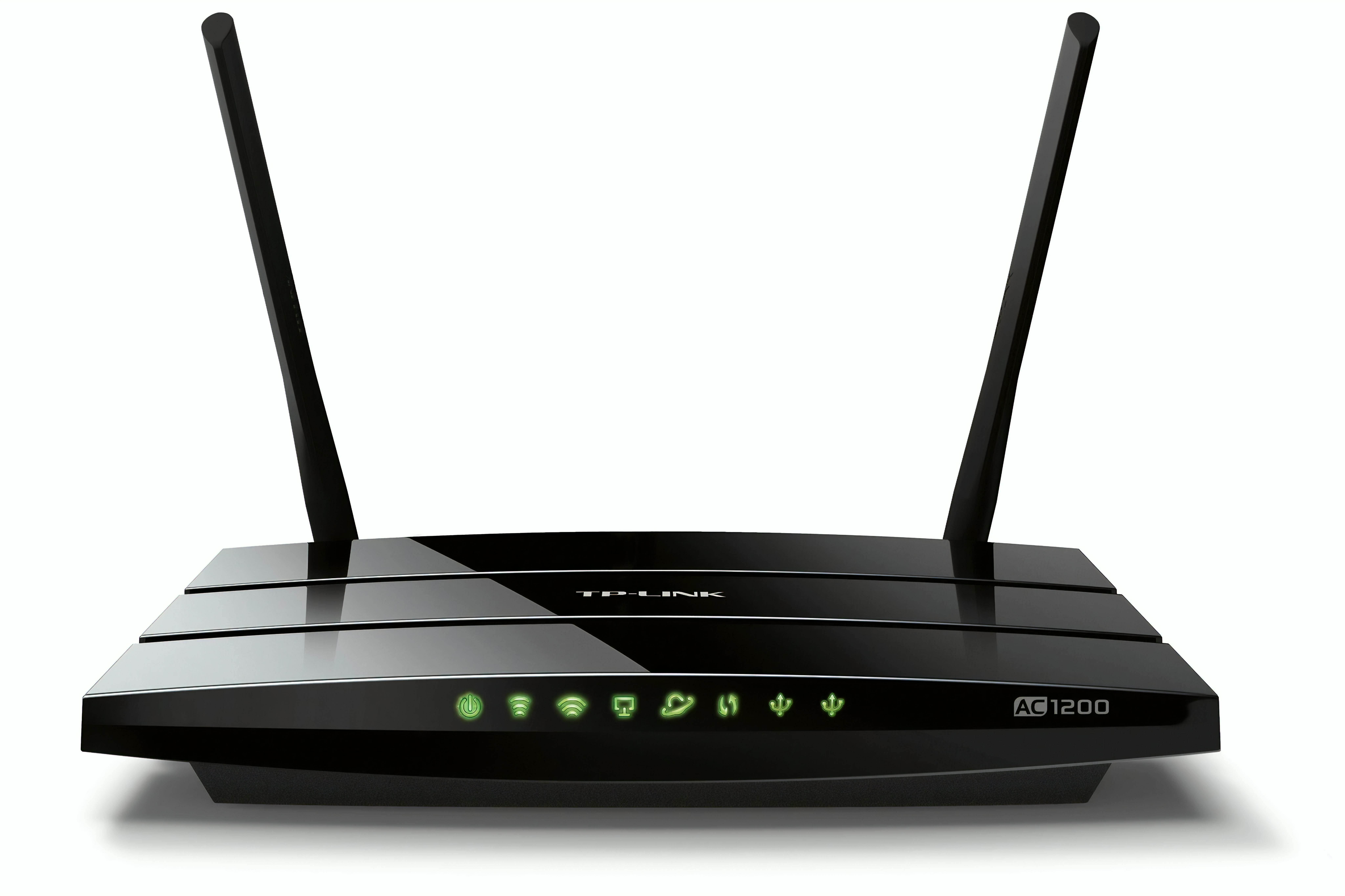 Het stijlvolle kastje van de TP-Link Archer C5 oogt erg stevig. Ook het (meer dan) twee keer zo zware gewicht, vergeleken met de andere geteste routers, wijst op een goede bouwkwaliteit. De twee positioneerbare antennes van deze simultane dualband-router (300 Mbit/s op de 2,4GHz-band en 867 Mbit/s op de 5GHz-band oftewel AC1200) dien je zelf te bevestigen aan gouden coax-connectoren (type rp-sma) die ook geschikt zijn voor optionele krachtigere antennes. Alle aansluitingen bevinden zich aan de achterkant: één gigabit-wan-poort (blauw), vier gigabit-lan-poorten (geel) en twee usb2.0-poorten (wit). Aan de voorzijde vind je acht status-leds, waarvan er vier de status van de lan-poorten tonen. Aan de onderkant zijn er twee uitsparingen waarmee je de router desgewenst aan de wand bevestigt.