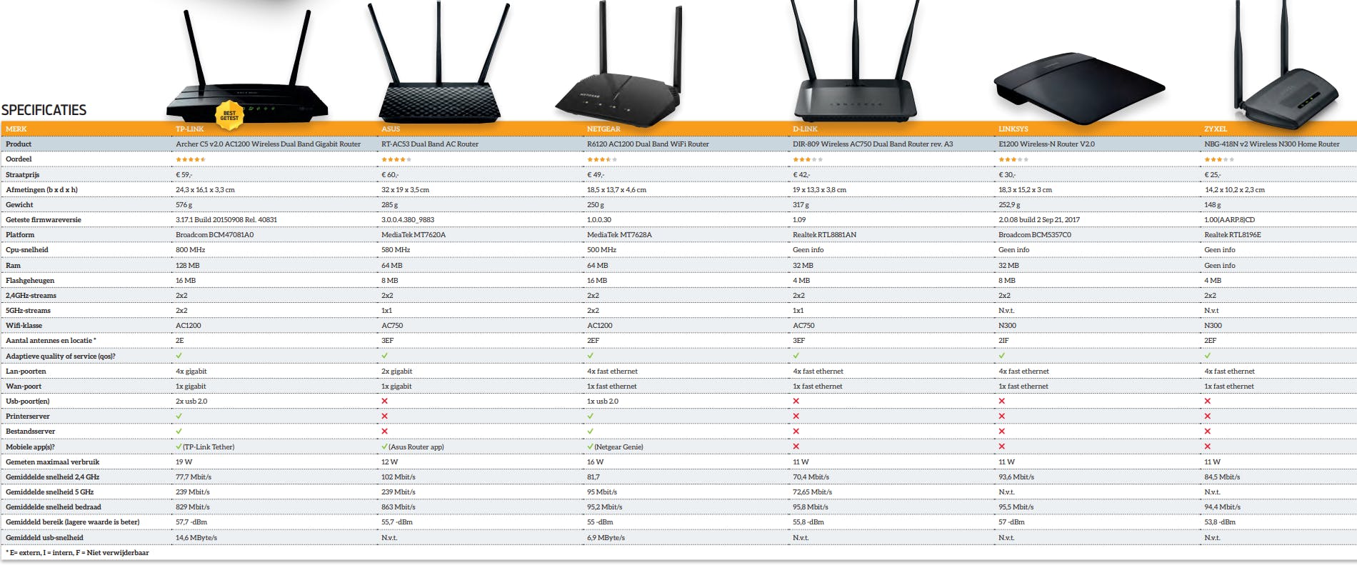 Voor minder dan zestig euro koop je toch behoorlijk wat router, maar compromissen zijn onvermijdelijk. Netwerkpoorten werken vaak maar op fast-ethernetsnelheid (100 Mbit/s in plaats van 1 Gbit/s), een usb-poort is niet altijd aanwezig en de wifi-chips zijn niet de nieuwste. De TP-Link Archer C5 combineert sterke prestaties met een goede bouwkwaliteit en een complete verzameling functies en specificaties. Het is de terechte winnaar van deze test. De ASUS RT-AC53 is een eerbare tweede, die nog iets beter presteert, maar met een minder complete uitrusting (maar twee lan-poorten, geen usb-poort).