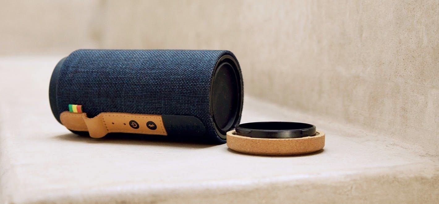 Het Amerikaanse merk House of Marley is in samenspraak met de kinderen van de legendarische reggaezanger opgericht. De focus ligt op een ecologisch verantwoorde productie met een uitgekiend design. Het uiterlijk van de No Bounds Sport oogt dan ook erg strak. Net als de geteste Anker Soundcore Flare is de waterdichte behuizing cilindervorming en produceert deze speaker 360graden-geluid. De voet is van kurk, wat zorgt voor een goede demping van ongewenste trillingen. Deze voet is afneembaar, waarna je toegang hebt tot een opbergvak voor het usb-oplaadsnoer. Leuk bedacht, maar het is in de praktijk wel wat gedoe om de kabel in dit opbergvak te manoeuvreren.