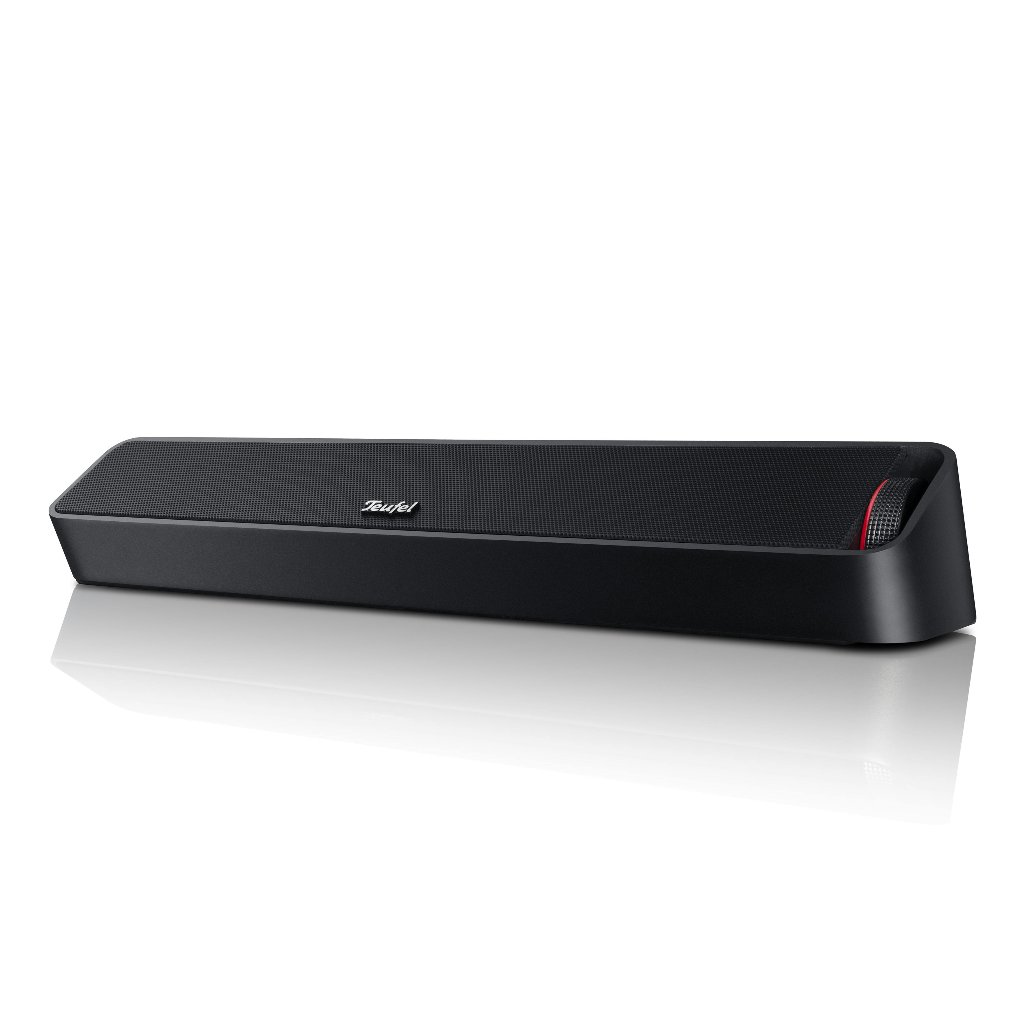 Zoals we van Teufel gewend zijn, kun je de Bamster uitsluitend via de webwinkel van het Duitse audiomerk bestellen. De langgerekte behuizing heeft een schuine onderkant, waardoor de twee actieve audiodrivers en passieve basradiatoren onder het metalen rooster iets achterover hellen. Zeker bij plaatsing op een tafel of bureau bereiken de geluidsgolven via een korte route je oren. Aan de zijkant bevindt zich een volumewiel, dat je dankzij rode ledverlichting ook nog in het donker kunt terugvinden. Deze zogenoemde ledring geeft ook aan wanneer de accu bijna leeg is. Aan de achterkant is er plek voor een oplaadpoort, 3,5mm-geluidsingang, bluetooth-knop en aan-uitschakelaar.