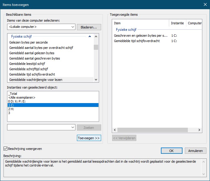 We beperken ons hiermee wel tot een ingebouwde prestatiemeter. Zorg dat je als administrator bent aangemeld, druk op Windows-toets+R en voer perfmon uit. In het linkerpaneel open je Controlehulpprogramma’s / Prestatiemeter. Rechts verschijnt een lege grafiek: geef hier zelf aan welk systeemonderdeel de tool moet meten en in de grafiek. Druk daarom op het groene plus-knopje, waarna je in een uitklapmenu uit verschillende computeritems kunt kiezen. Klik een pijltje naast zo’n item aan voor nog gedetailleerder opties. Om je een idee te geven: bij Fysieke schijf vind je maar liefst 21 verschillende meetbare onderdelen. Klik op Toevoegen>> bij de gewenste onderdelen en bevestig met OK.