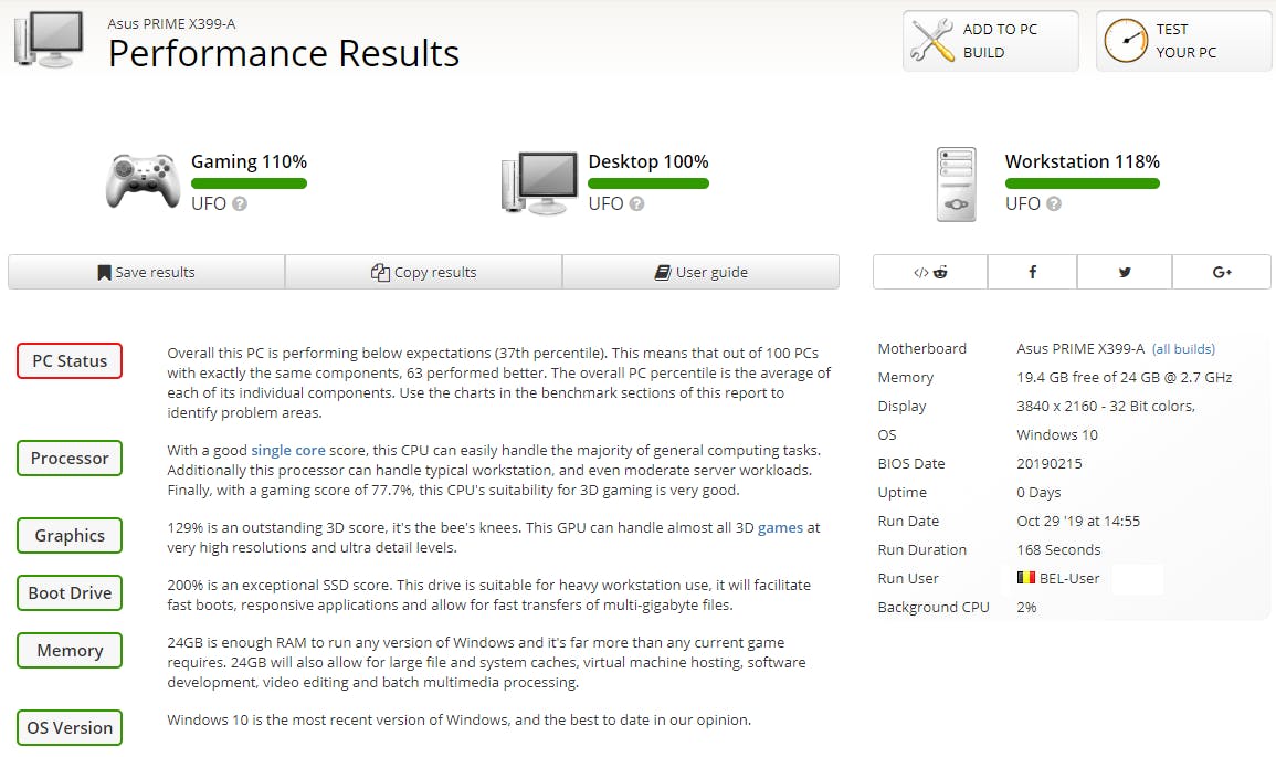 Na de test verschijnt het rapport in je browser. Hoe je systeem presteert, maakt UBM duidelijk met grappige classificaties van Tree trunk tot Speed boat en UFO. De criteria die UBM hanteert voor elk type pc, zoals Gaming pc, Desktop en Workstation, vind je hier terug. Voor een gaming-pc is dat bijvoorbeeld: 25%GCPU+50%GPU+15%SSD+10%HDD.